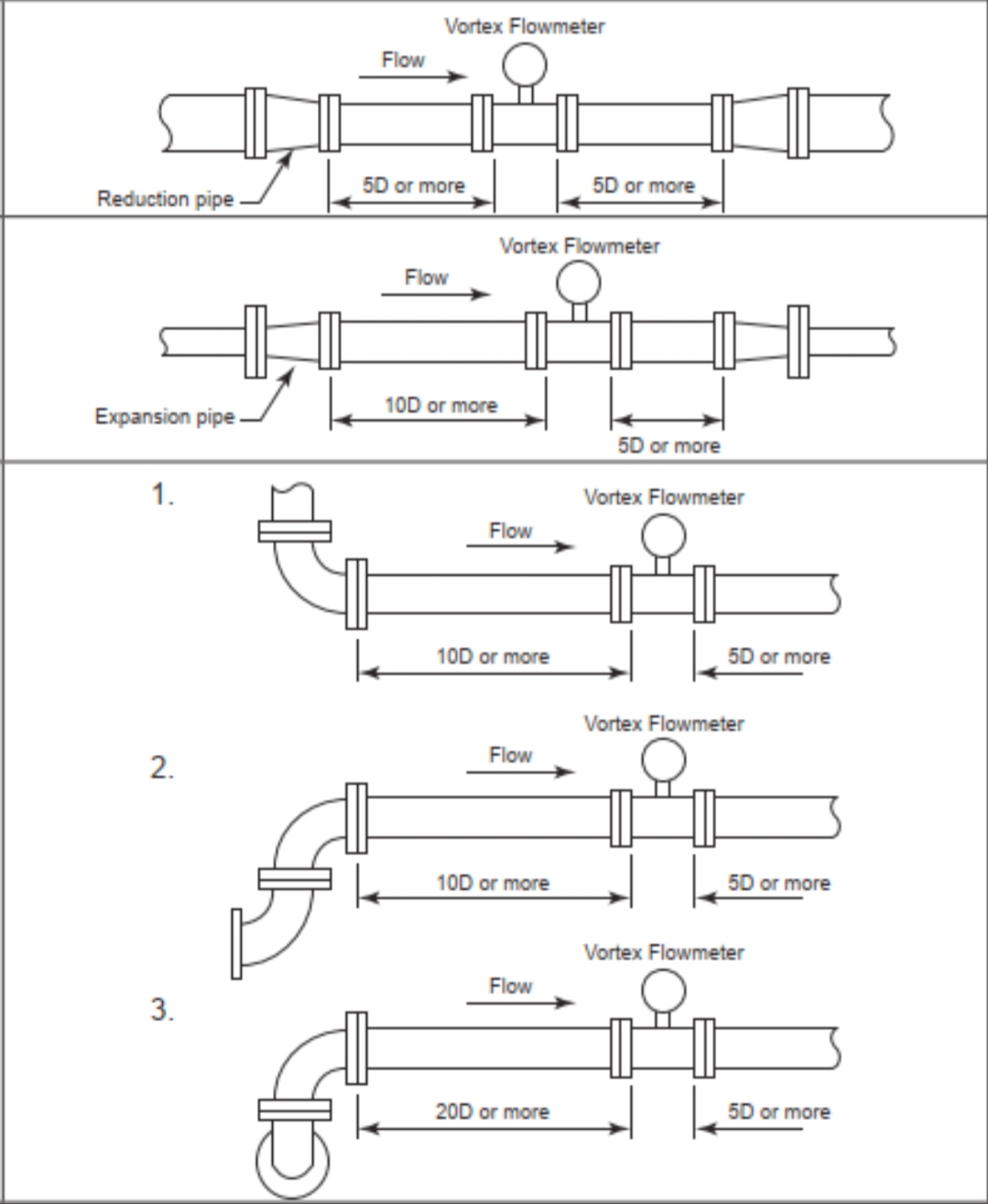3.Raka rörsektioner uppströms och nedströms (om temperatur- och tryckinstrument krävs, bör de installeras nedströms flödesmätaren. Nedströmsinstrumenten bör också placeras utanför den raka rörsektionen. Den rekommenderade arrangemangsordningen för flera instrument är: flödesmätare, tryckgivare, temperaturgivare). Se generellt sett kraven på raka rörlängder som anges i tillverkarens produktprov (eller den gemensamma riktlinjen för 15D uppströms och 5D nedströms enligt instrumentmanualerna). Informera rörteknikteamet om kraven för uppströms och nedströms raka rör för vortexflödesmätaren i förväg. När instrumenttillverkaren har valts måste installationskraven bekräftas på nytt enligt tillverkarens specifikationer.