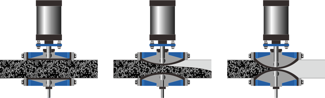 Stäng: Drivmekanismen (manuell, pneumatisk eller elektrisk) trycker två klämstänger och pressar ihop den fjädrande hylsan exakt längs mittlinjen för att uppnå en lufttät tätning. Även när fasta partiklar finns i mediet är de tätt inneslutna och blockerade.